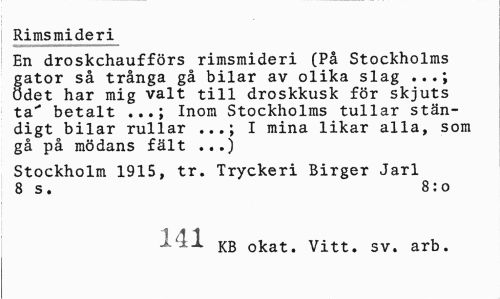 //// Rimsmideri //// En droskchaufförs rimsmideri (På Stockholms gator så trånga gå bilar av olika slag ...; ödet har mig valt till droskkusk för skjuts ta" betalt ...; Inom Stockholms tullar ständigt bilar rullar I mina likar alla, som gå på mödans fält ...) //// Stockholm 1915, tr. Tryckeri Birger Jarl 8 s. 8:0 //// KB okat. Vitt. sv. arb. ////