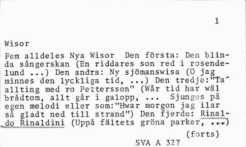 //// 1 //// Wisor //// Fem alldeles Nya Wisor Den första: Den blinda sångerskan (En riddares son red i rosende-lund ...) Den andra: Ny sjömanswisa (0 jag minnes den lyckliga tid, ...) Den tredje:"Ta" allting med ro Pettersson" (Wår tid har wäl brådtom, allt går i galopp, ... Sjunges på egen melodi eller som:"Hwar morgon jag ilar så gladt ned till strand") Den fjerde: Rinal-do Rinaldini (Uppå fältets gröna parker, 777) //// (forts) //// SVA A 1 ////