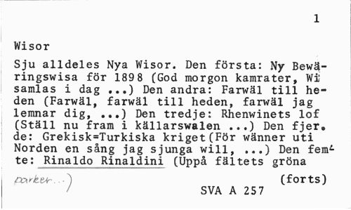 //// 1 //// Wisor //// Sju alldeles Nya Wisor. Den första: Ny Bewä-ringswisa för 189 8 (God morgon kamrater, Wi samlas i dag ,..) Den andra: Farwäl till heden (Farwäl, farwäl till heden, farwäl jag lemnar dig, ..,) Den tredje: Rhenwinets lof (Ställ nu fram i källarswalen ...) Den fjer, de: Grekisk<Turkiska kriget (För wänner uti Norden en sång jag sjunga will, ...) Den fem* te: Rinaldo Rinaldini (Uppå fältets gröna //// FcurklUr-..-') (forts) //// SVA A 25 7 ////