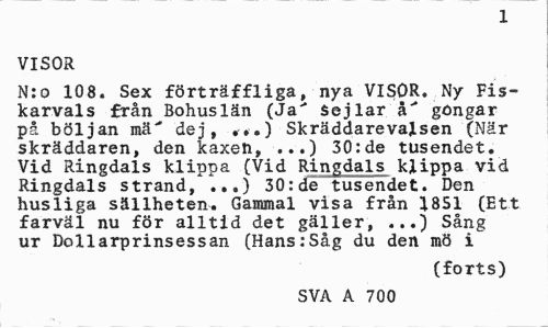 //// 1 //// VISOR //// N:o 108. Sex förträffliga, nya VISOR. Ny Fiskarvals från Bohuslän (Ja" Sejlar å" gongar på böljan mä" dej, ,..) Skräddarevalsen (När skräddaren, den kaxeh, ...) 30:de tusendet. Vid Ringdals klippa (Vid Ringdals klippa vid Ringdals strand, ..») 30:de tusendet. Den husliga sällheten. Gammal visa från 1851 (Ett farväl nu för alltid det gäller, ...) Sång ur Dollarprinsessan (Hans:Såg du den mö i //// (forts) //// SVA A 700 ////
