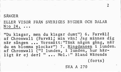 //// 2 //// SÅNGER //// ELLER VISOR FRÅN SVERIGES BYGDER OCH DALAR N:o 24. . .. //// "Du klagar, men du klagar dumt") 6. Farväl! af Chronwall (FarvälJ min vän.1 Jag minnes dig när sången ... Versmått:"Tänk någon gång, när du en blomma plockar") 7. Ringdansen i lunden, af Chronwall ("I lunden, i lunden, hur härligt är ej der! "... Mel.:" Bland Wärends //// (forts) //// SVA A 2 70 ////