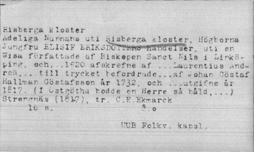 //// Riaberga kloster //// Adeliga fiunnars uti Maberga kloster, Högborna Jungfru ELISIF ERIKdwl M«J fRllWeTber, a t i er. V» i sa författade af Biskopen Sanct Kils i Linköping, och, .1520 af ak ref ne af .. Laurentius Andrea ,,. till trycket \eford rade..,af vohan Oös taf Hal.i'!:an Gostafsson år 1732. och ."„ ..utgif ne år 1817 (I Ostgötha bodde en Herre så bald,, , .) Strenrriäs (I8t7)v tr C .F .Ekwarck 16 s, ' ? o //// UUB Fclkv kap al ////