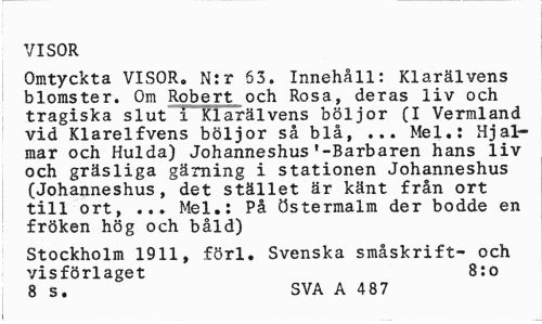 //// VISOR //// Omtyckta VISOR. W:r 63. Innehåll: Klarälvens blomster. Om Robert och Rosa, deras liv och tragiska slut i Klarälvens böljor (I Vermland vid Klarelfvens böljor så blå, ... Mel.: Hjalmar och Hulda) Johanneshus'-Barbaren hans liv och gräsliga gärning i stationen Johanneshus (Johanneshus, det stället är känt från ort till ort, ... Mel.: På Östermalm der bodde en fröken hög och båld) //// Stockholm 1911, förl. Svenska småskrift- och visförlaget 8:0 //// 8 s. SVA A 487 ////