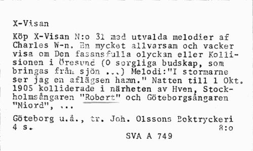 //// X-Visan //// Köp X-Visan N:o 31 med utvalda melodier a£ Charles W-n. En mycket allvarsam och vacker visa om Den fasansfulla olyckan eller Kollisionen i öresunc (0 sorgliga budskap, som bringas från sjön ,} Melodi:"I stormarne ser jag en aflägsen hamn." Natten till 1 Okt» 1905 kolliderade i närheten av Hven, Stockholmsångaren "Robert" och Göteborgsångaren "Niord", //// Göteborg u.å., tr. Joh. Olssons Boktryckeri 4 s - R: o //// SVA A 74 9 ////