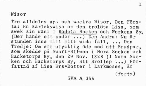 //// Wisor //// Tre alldeles nya och wackra Wisor, Den Första: En Kärlekswisa om den trolösa Lisa, som swek sin v/än: I Rodola Socken och Werkena By, (Der hände ett under ...) Den Andra: Nu är stunden inne till mitt wida fall, ... Den Tredje: Om ett olycklig öde med ett Brudpar, som skedde på Swart=Elfwen i Nora Socken och Backetorps By, den 29 Nov. 1828 (I Nora Socken och Backetorps By, Ett Bröllop ...) Författad af Lisa Ers=Dotter i Lärkmosés, år //// (forts) //// SVA A 355 ////