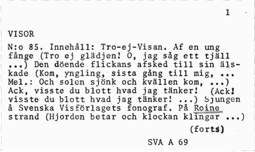 //// 1 //// VISOR //// N:o 85. Innehåll: Tro-ej-Visan. Af en ung fånge (Tro ej glädjen! 0, jag såg ett tjäll ...) Den döende flickans afsked till sin älskade (Kom, yngling, sista gång till mig, ... Mel.: Och solen sjönk och kvällen kom, ...) Ack, visste du blött hvad jag tänker! (Ack! visste du blott hvad jag tänkerI ...) Sjungen å Svenska Visförlagets fonograf. På Roine strand (Hjorden betar och klockan klingar ...) //// (forts) //// SVA A 69 ////