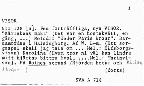//// 1 //// VISOR //// N:c 138 [a]. Fem förträffliga, nya VISOR. "Kärlekens makt" (Det var en höstekväll, en gång, ...) Melodi: "Under Paris broar". Barnamorden i Hälsingborg. Af W. L—m. (Ett sorgespel skall jag tala om ... Mel.: Elfsborgs-visan) Karolina (Hvem tror ni väl kan lindra mitt hjärtas bittra kval, ...Mel.: Marinvisan). På Roines strand (Hjorden betar och klocka //// kliv^ar..} (forts) //// SVA A 718 ////