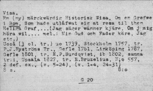 //// Visa. //// Fr (ny) märckwärd ip Historisk wisa, On en C» ref ve //// 1 Hot, Som hade utl&fwat sig at resa til then HeTTFk Graf,...(Jag säger wänner kjäre-, Om j mig höra wil,.,. nel.: Win 3ud och Fader käre, Jag etc.) //// Uooi (3 ol. tr.) uo 1739, Stockholm 1757, tr. P.J.Nyströms Tr., Gefle 1761, Linköping 1787, Gefle 1801, tr. E.P.Su^dqvlst, ib 1802, samma tr; i, Upsala 1.827, tr . E .Bruzelius , 31: o //// 2 def. ex., (v. 5-24), (v. 1-4, 24-31) //// 8 s. o:o //// 20 ////
