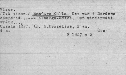 //// /isor. //// 'Två visor./ Komfars Källa, Det vmr i bordens itä/nper iil..Vilsko^s-Äiötét. Der vinternatt //// ivrar*?,... //// fJosala 1827, tr. i..Bruaelius, 2 ex. //// 4 s. 8:o //// K 1327 n 2 ////