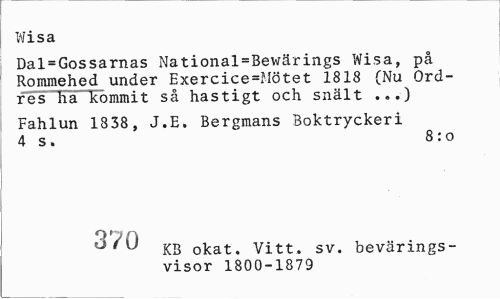 //// Wisa //// Dal=Gossarnas National=Bewärings Wisa, på Rommehed under Exercice=?fötet 1818 (Nu Ordres ha kommit så hastigt och snält ...) //// Fahlun 1838, J.E. Bergmans Boktryckeri 4 s. 8:o //// 'J ' KB okat. Vitt. sv. bevärings- //// visor 1800-1879 ////