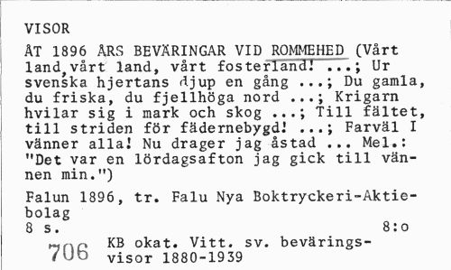//// VISOR //// ÄT 1896 ARS BEVÄRINGAR VID RQMMEHED (Vårt land^vårt land, vårt fosterland! .Ur svenska hjertans djup en gång ...; Du gamla, du friska, du fjellhöga nord ...; Krigarn hvilar sig i mark och skog Till fältet, //// till striden för fädernebygd! Farväl I //// vänner alla! Nu drager jag åstad ... Mel.: "Det var en lördagsafton jag gick till vännen min.") //// Falun 1896, tr. Falu Nya Boktryckeri-Aktiebolag //// 8 s. 8:o //// KB okat. Vitt. sv. bevärings-#Ub visor 1880-1939 ////