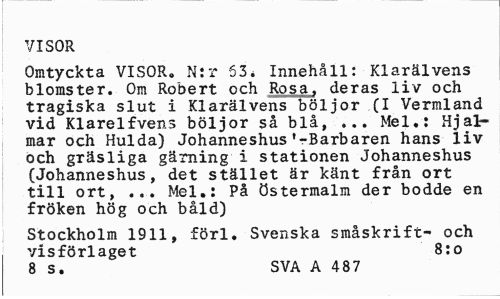 //// VISOR //// Omtyckta VISOR. N:r 53* Innehåll: Klarälvens blomster. Om Robert och Rosa. deras liv och tragiska slut i Klarälvens böljor C* Vermland vid Klarelfvens böljor så blå, ... Mel.: Hjalmar och Hulda) Johanneshus'-Barbaren hans liv och gräsliga gärning i stationen Johanneshus (Johanneshus, det stället är känt från ort till ort, ... Mel.: På Östermalm der bodde en fröken hög och båld) //// Stockholm 1911, förl. Svenska småskrift- och visförlaget 8:0 //// 8 S. SVA A 487 ////