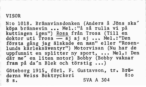 //// VISOR //// N:o 1018. Erännvinsdonken (Anders å Jöns ska"" köpa brännevin ... Mel.:"å så rulla vi på kuttingen igen") Rosa från Trosa (Till en doktor uti Trosa — aj aj aj Mel.i"Den första gång jag älskade en man" eller "Rosenlunds kärleksäventyr") Motorvisan (Nu har de uppfunnit en splitter ny sport, ... Mel.: Den där me" en liten motor) Bobby (Bobby vaknar fram på da"n Blek och törstig .*.) //// Göteborg 1915, förl. F. Gustavson, tr4 Bröderna Weiss Boktryckeri 8:o 8 s. SVA A 304 ////