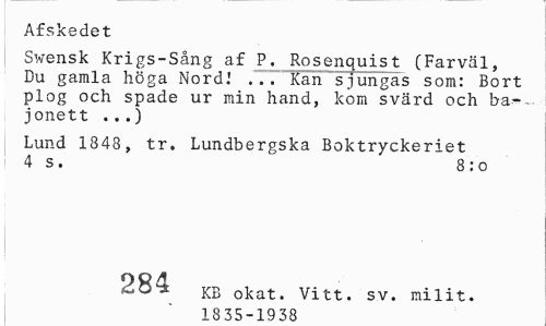 //// Afskedet //// Svensk Krigs-Sång af P. Rosenquist (Farväl, Du gamla höga Nord.' ... Kan sjungas som: Bort plog och spade ur min hand, kom svärd och ba-~ jonett ...) //// Lund 1848, tr. Lundbergska Boktryckeriet 4 s. 8:0 //// 284 KB okat. Vitt. sv. milit. //// 1 8 .^R ////