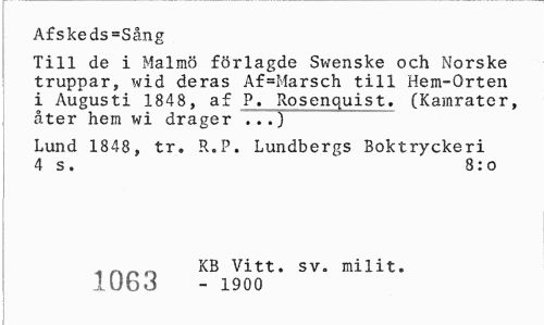 //// Afskeds=Sång //// Till de i Malmö förlagde Swenske och Norske truppar, wid deras Af=Marsch till Hem-Orten i Augusti 1848, af P. Rosenquist. (Kamrater, åter hem wi drager ...) //// Lund 1848, tr. R.P. Lundbergs Boktryckeri 4 s. 8: o //// KB Vitt. sv. milit. iUbd - 1900 ////