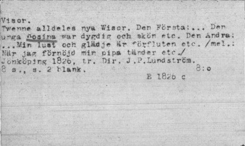 //// Vi a or. //// alldeles nya Wisor. Don Första:... Den u"ga ^gaina yar dygd ig och skön etc. Den Andra; ... Min luaf och glädje %r ^örfluten etc. /mel.: Nar jag förnöjd mir pipa tänder etc./ Jönköping l8k'ö, tr. Dir. J.P.Lundström. 8 s ., 3 . 2 blank . 8: o //// B 18«É> c ////