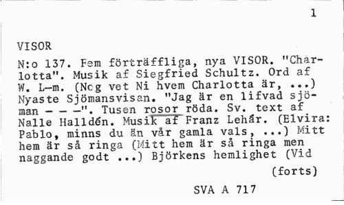 //// 1 //// VISOR //// N:o 137. Fem förträffliga, nya VISOR. "Charlotta". Musik af Siegfried Schultz. Ord af W. L-m. (Neg vet Ni hvem Charlotta är, ...) Nyaste Sjömansvisan. "Jag är en lifvad sjöman ---". Tusen rosor röda. Sv. text af //// Nalle Halidén. Musik af Franz Lehår. (Elvira: Pablo, minns du än vår gamla vals, ...) Mitt hem är så ringa (Mitt hem är så ringa men naggande godt ...) Björkens hemlighet (Vid //// (forts) //// SVA A 717 ////