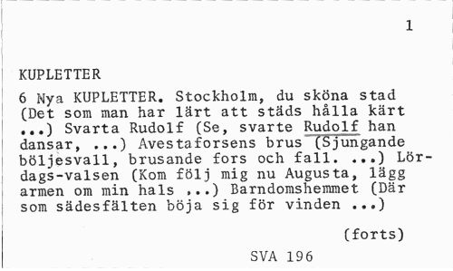 //// 1 //// KUPLETTER //// 6 Nya KUPLETTER. Stockholm, du sköna stad (Det som man har lärt att städs hålla kärt //// Svarta Rudolf (Se, svarte Rudolf han dansar, ...) Avestaforsens brus (Sjungande böljesvall, brusande fors och fall. ...) Lör-dags-valsen (Kom följ mig nu Augusta, lägg armen om min hals ,..) Barndomshemmet (Där som sädesfälten böja sig för vinden ...) //// (forts) //// SVA 196 ////