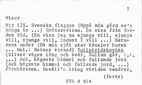 //// 1 //// Wisor //// N:r 125. Svenska flaggan (Uppå min gård se'n många år ...) Gråtarevisan. En visa från fordom tid. (En visa jag nu sjunga vill, sjunga vill, sjunga vill, Endast I vill ...) Naturens under (Då min själ utav känslor buren ... Mel.: Roines strand) Rullskridskovisa (Bliver vägen lång och svår, Rullan går, :,:, ...) Ack, högaste himmel och fallande jord (Ack högaste himmel och fallande jord, ...) Järnbäraren. Gesäll'n kring världen vandrar, //// (forts) //// SVA A 814 ////
