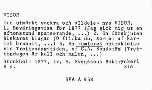 //// VISOR //// Tre utmärkt vackra och alldeles nya VISOR. 1. Beväringsvisa för 1877 (Jag gick mig ut en aftonstund spatserande, ...) 2. En förskjuten älskares klagan (0 flicka du, soej af kärlek brunnit, ...) 3. En rumlares betraktelse vid Trettondagstiden, a i" C. A. Sands tén (Trettondagen är kall och mulen, ...) //// Stockholm 1877, tr. E. Svenssons Boktryckeri 8 s. 8:q //// SVA A 9 38 ////