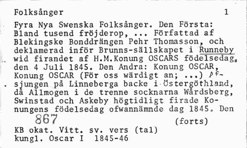 //// Folksånger 1 //// Fyra Nya Swenska Folksånger. Den Första: Bland tusend fröjderop, ... Författad af Blekingske Bonddrängen Pehr Thomasson, och deklamerad inför Brunns-sällskapet i Runneby «„ wid firandet af H.M.Konung OSCARS födelsedag, den 4 Juli 1845. Den Andra: Konung OSCAR, Konung OSCAR (För oss wärdigt an; ...) P^-, sjungen på Linneberga backe i östergöthland, da Allmogen i de trenne socknarna Wårdsberg, Swinstad och Askeby högtidligt firade Konungens födelsedag ofwannämnde dag 1845., Den //// 867 (forts) //// KB okat. Vitt. sv. vers (tal) kungl. Oscar I 1845-46 ////