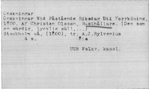 //// Cnskni nfrar //// Önskningar Wid Påstående Riksda.tr Uti Forrköoin*, 1?00» Af Christen Olsson, Rusthallare. (Den som p n vm rd i <?, lyck 1 i <? säl l, „, . Stockhnl-n uå, (1800), tr, A. J, Sylvenius 4s. 8: • //// UUB Folkv. kapsl. ////