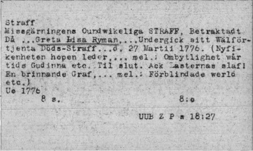 //// Straff //// Missgärningens Oundwikeliga STRAFF, Betraktad t //// *»»Sreta &i«a Ryroan. ? . .Undergick sitt Fälfor-tjenta T>o<U-§traff.. "J . 27 Martii 1776. (Nyfikenheten hopen leder,,,, »el.; Ombytlighet war tids Gudinna etc, Til slut. Aek Lasternas slafl En brinnande Gr af, mel.i Förblindade werlo //// <~tC.) //// Uo 177fc //// 8 s. 8; o //// UUB Z P s l8;2? ////