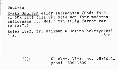 //// Snufvan //// Ryska Snufvan eller Influensan (Godt folk! vi ock fått till vår stad Den förr moderna influensan ... Mel.:"Min salig farmor var så rar".) //// Luleå 1892, tr. Hallman & Helins boktryckeri 4 s. 8:0 //// "'Q KB okat. Vitt. sv. världsl. //// poesi 1890-1899 ////