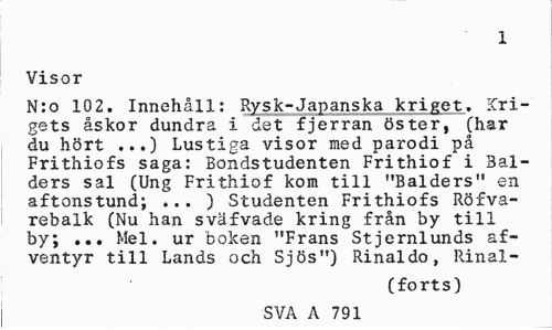 //// 1 //// Visor //// N:o 102. Innehåll: Rysk-Japanska kriget. Krigets åskor dundra i det fjerran öster, (har du hört ...) Lustiga visor med parodi på Frithiofs saga: Bondstudenten Frithiof i Balders sal (Ung Frithiof kom till "Balders" en aftonstund; ... ) Studenten Frithiofs Röfva-rebalk (Nu han sväfvade kring från by till by; ... Mel. ur boken "Frans Stjernlunds af-ventyr till Lands och Sjös") Rinaldo, Rinal- //// (forts) //// SVA A 791 ////