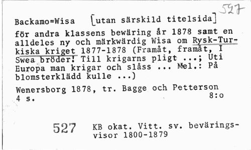 //// 1 //// Backamo=Wisa i.utan särskild titelsida] //// för andra klassens bewäring år 1878 samt en alldeles ny och märkwärdig Wisa om Rysk-Tui^ kiska kriget 1877-1878 (Framåt, framåt, I Swea bröder!" Till krigarns pligt ...; Uti Europa man krigar och slåss ... Mel,: På blomsterklädd kulle ...) //// Wenersborg 1878, tr. Bagge och Petterson 4 s. 8:o //// 527 KB okat. Vitt. sv. bevärings- //// visor 1800-1879 ////