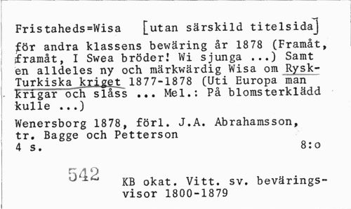 //// Fristaheds=Wisa [utan särskild titelsida] //// för andra klassens bewäring år 1878 (Framåt, framåt, I Swea bröder! Wi sjunga ...) Samt en alldeles ny och märkwärdig Wisa om Rysk-Turkiska kriget 1877-1878 (Uti Europa man • krigar och slåss ... Mel.: På blomsterklädd kulle ...) //// Wenersborg 1878, förl. J.A. Abrahamsson, tr. Bagge och Petterson //// 4 s. 8:o //// J 1 KB okat. Vitt. sv. bevärings- //// visor 1800-1879 ////