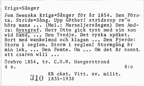 //// Krigs=Sånger //// Fem Swenska Krigssånger för år 1854. Den Första. Strids=Sång. Upp Göther.' stridsrop re"n hörs mana ... (Mel.: Marseljersången) Den Andra; Ryssgraf. Herr Otto gick tyst med sin son wid hand, "... Den Tredje. Det ryska spöket. Bort med wankelmod och klagan ... Den Fjerde: Storm i seglen. Storm i seglen! Stormgång är min lek, ... Den Femte. Om ... Om det är sannt. att czaren will .,. //// Örebro 1854, tr. C,O.W. Haegerstrand 8 s. 8:o //// 0 KB okat. Vitt. sv. milit. //// dlG 1835-1933 ////