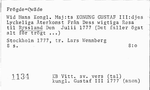 //// Frögde=Owäde //// Wid Hans Kongl. Maj:ts KONUNG GUSTAF Illrdjes Lyckeliga Återkomst Från Dess wigtiga Rasa til Ryssland Den Julii 1777 (Det faller ögat alt för trögt ...) //// Stockholm 17 77, tr. Lars Wennberg 8 s. 8:o //// 1134 KB Vitt. sv. vers (tal) //// kungl. Gustaf III 177 7 (anon) ////