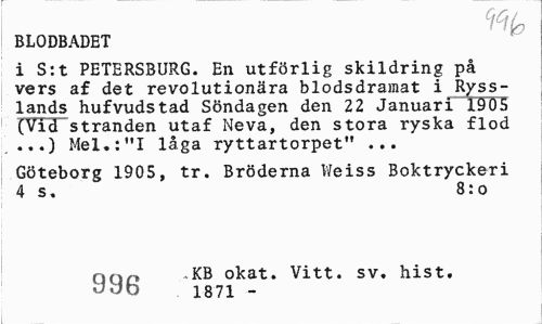 //// nio //// BLODBADET //// i S:t PETERSBURG. En utförlig skildring på vers af det revolutionära blodsdramat i Rysslands hufvudstad Söndagen den 22 Januari 1905 (Vid stranden utaf Neva, den stora ryska flod ...) Mel.:"I låga ryttartorpet" ... //// Göteborg 1905, tr. Bröderna Weiss Boktryckeri 4 s. 8:o //// qqp .KB okat. Vitt. sv. hist. //// JJb 1871 - ////