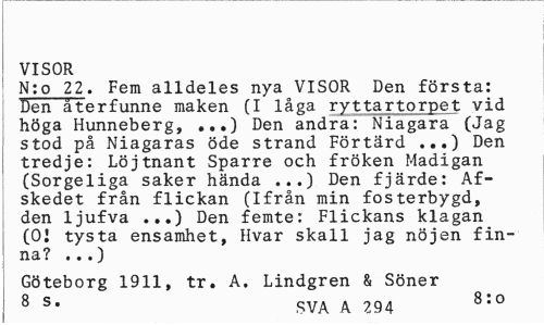 //// VISOR //// N:o 22. Fem alldeles nya VISOR Den första: Den återfunne maken (I låga ryttartorpet vid höga Hunneberg, ...) Den andra: Niagara (Jag stod på Niagaras öde strand Förtärd ...) Den tredje: Löjtnant Sparre och fröken Madigan (Sorgeliga saker hända ...) Den fjärde: Af-skedet från flickan (Ifrån min fosterbygd, den ljufva ...) Den femte: Flickans klagan (0! tysta ensamhet, Hvar skall jag nöjen finna? ...) //// Göteborg 1911, tr. A. Lindgren & Söner 8 s' SVA A 294 8:0 ////