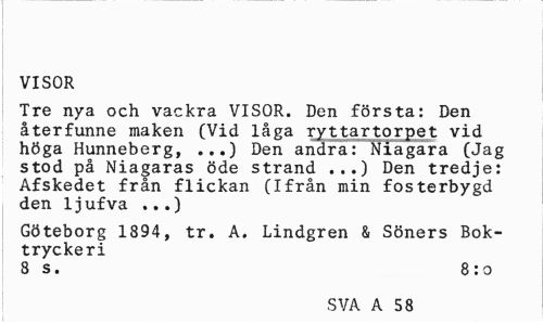 //// VISOR //// Tre nya och vackra VISOR. Den första: Den återfunne maken (Vid låga ryttartorpet vid höga Hunneberg, ...) Den andra: Niagara (Jag stod på Niagaras öde strand ...) Den tredje: Afskedet från flickan (Ifrån min fosterbygd den 1jufva ...) //// Göteborg 1894, tr. A. Lindgren & Söners Boktryckeri //// 8 s. 8 :o //// SVA A 58 ////