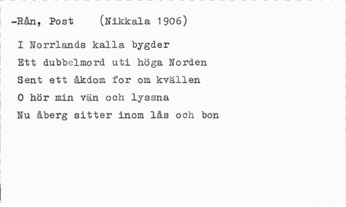 //// -Hån, Post (Nikkala 1906) //// I Norrlands kalla bygder Ett dubbelmord uti höga Norden Sent ett åkdom for om kvällen 0 hör min vän och lyssna Nu åberg sitter inom lås och bon ////