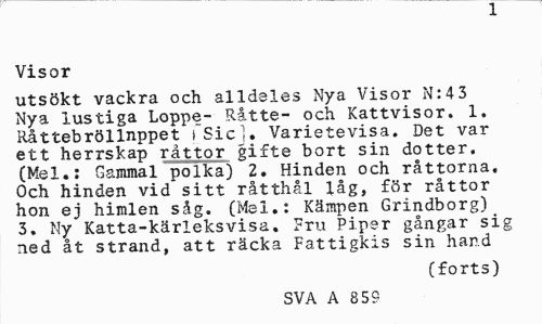 //// 1 //// Visor //// utsökt vackra och alldeles Nya Visor N:4 3 Nya lustiga Loppe- Råtte- och Kattvisor. 1. Råttebröllnppet fSicj» Varietevisa. Det var ett herrskap råttor gifte bort sin dotter. (Mel.: Gammal polka) 2. Hinden och råttorna. Och hinden vid sitt råtthål låg, för råttor hon ej himlen såg. (Mel.: Kämpen Grindborg) 3. Ny Katta-kärleksvisa. Fru Piper gångar sig ned åt strand, att räcka Fattigkis sin hand //// (forts) //// SVA A 859 ////