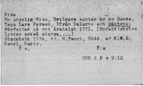 //// Vi sa -w //// Fn Andelifc Wiaa, Hwilkens Auctor är en Bonde, Tepp Lars Person, Ifrån Dalarne och gältwik; Författad på det åratalet 1771- (Enfald isrhelpn lyster också siu^sra, ,») //// Stockholm 1776, tr, H.Fou*t, Ridd. af K.V,O. Konirl. Eoktr. //// 8 s. 8:o //// UUB Z P s 9:12 ////