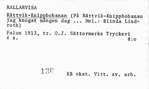 //// RALLARVISA //// Rättvik-Knip^bobanan (På Rättvik-Knippbobanan jag knogat mangen dag ... Mel.: Blinda Lindroth) //// Falun 1913, tr. O.J. Sättermarks Tryckeri 4 s. 8:0 //// J oV KB okat. Vitt. sv. arb. ////