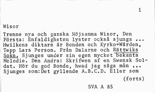 //// 1 //// Wisor //// Trenne nya och ganska Nöjsamma Wisor, Den Första: Enfaldigheten lyster också sjunga ... Hwilkens diktare är Bonden och Kyrko=Wärden, Tepp Lars Person, Från Dalarne och Rättwiks Sokn, Sjunges under sin egen mycket "bekanta Melodie. Den Andra: Skrifwen af en Swensk Soldat. Hör du god Bonde, hwad jag säga mån ... Sjunges som:Det gyllende A.B.C.D» Eller som //// (forts) //// SVA A 85 ////