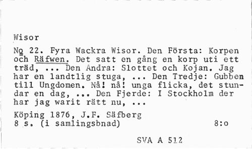 //// Wisor //// Nq 22. Fyra Wackra Wisor. Den Första: Korpen och Räfweru Det satt en gång en korp uti ett träd, ... Den Andra: Slottet och Kojan. Jag har en landtlig stuga, ... Den Tredje: Gubben till Ungdomen. Nål nå! unga flicka, det stundar en dag, ... Den Fjerde: I Stockholm der har jag warit rätt nu, ... //// Köping 1876 , J.F. Säfberg 8 s» (i samlingsbnad) 8:o //// SVA A 512 5 ////