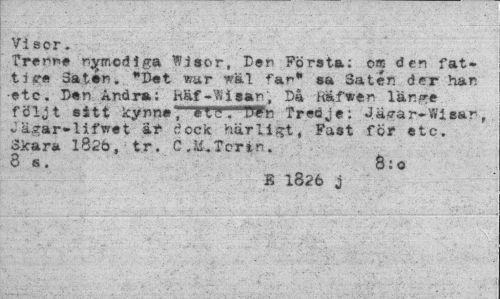 //// Visor. //// Trenr># r.^mcdiga Wisor, Ben Första: om den fattige Saten. "Bet war -wäl *'ar* sa Saten der har; •etc. Den Andra; häf-Yiisar, Då Rafwer lär.<re följt sitt kynneél9. Wn Tredje: J.ägar-WisAr, Cägar-lifwet %*¦ dock härligt, Fast för etc. 3ka ra 1826, tr. C .ii. Ter in. 8 s. 8:0 //// B 1826 j //// ••'v'-,,:.. 'S.' :i/;; - - , i; ////