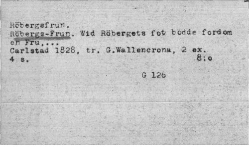 //// Rcbergafrun. //// Robens-Frun. Wid Röbergets fot- bodde fordom ef fru . //// Carlstad 1828, tr. G.Wallencrona, 2 ex. //// 4 s. 8; o //// G 126 ////