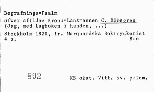 //// Begra£nings=Psalm //// öfwer aflidne Krono=Länsmannen C. Röösgren (Jag, med Lagboken i handen, ...) //// Stockholm 1820, tr. Marquardska Boktryckeriet 4 s. 8:0 //// 892 KB okat. Vitt. sv. polem, ////