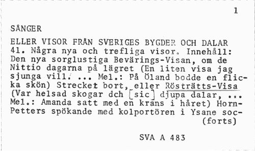 //// 1 //// SÅNGER //// ELLER VISOR FRÅN SVERIGES BYGDER OCH DALAR 41. Några nya och trefliga visor, Innehåll: Den nya sorglustiga Bevärings-Visan, om de Nittio dagarna på lägret (En liten visa jag sjunga vill; ..". Mel.: På Öland bodde en flicka skön) Strecket bort,_eller Rosträtts^Visa (Var helsad skogar dch [sic] djupa dalar, ... Mel.: Amanda satt med en krans i håret) Horn-Petters spökande med kolportören i Ysane soc- //// (forts) //// SVA A 483 //// i ////