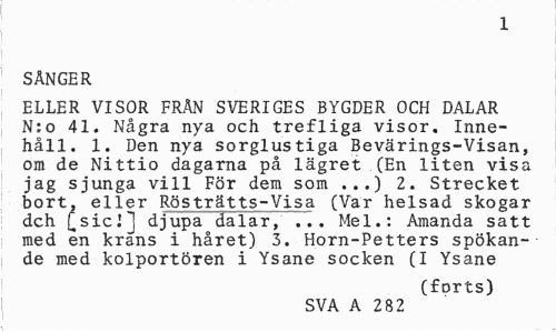 //// 1 //// SÅNGER //// ELLER VISOR FRÄN SVERIGES BYGDER OCH DALAR N:o 41. Några nya och trefliga visor. Innehåll. 1. Den nya sorglustiga Bevärings-Visan, om de Nittio dagarna på lägret (En liten visa jag sjunga vill För dem som ...) 2. Strecket bort, eller Rösträtts-Visa (Var helsad skogar dch £sicJ] djupa dalar, ... Mel.: Amanda satt med en krans i håret) 3. Horn-Petters spökande med kolportören i Ysane socken (I Ysane //// (forts) //// SVA A 282 ////