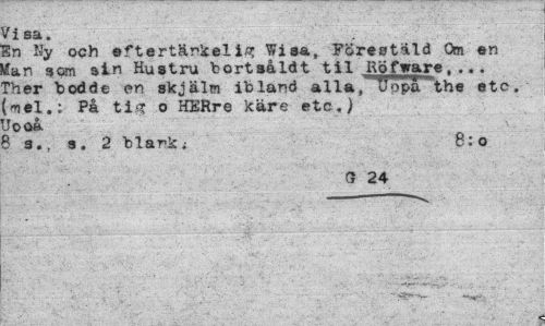 //// Vi sa. //// Sn Ny och ef tertänkel i*? Wisa, Forestild Om en Iffan gom sin Hustru bortsåldt til Röfware... rher bodde en skjälrn ibland alla, uppa^the etc. (mel.: På ti.cs o HERre käre etc.) Uooå //// B 3., s. 2 blank; 8:o //// a 24 //// " ^--- "»«-: ////