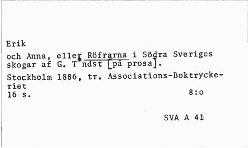 //// Erik //// och Anna, ellej Röfrarna i Södra Sveriges skogar af G. T ndst [på prosaj. //// Stockholm 1886, tr. Associations-Boktrycke-riet //// 16 s. 8:0 //// SVA A 41 ////