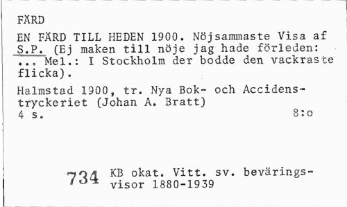 //// FÄRD //// EN FÄRD TILL HEDEN 1900. Nöjsammaste Visa af S.P. (Ej maken till nöje jag hade förleden: //// Mel.: I Stockholm der bodde den vackraste flicka). //// Halmstad 1900, tr. Nya Bok- och Accidens-tryckeriet (Johan A. Bratt) 4 s. 8:o //// okat. Vitt. sv. bevärings- //// visor 1880-1939 ////